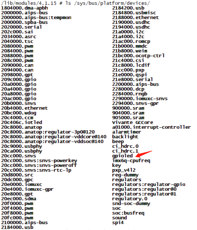 3、如果设备树中添加了 gpioled 节点,在 /sys/bus/platform/devices/ 目录下会存在该设备文件。
